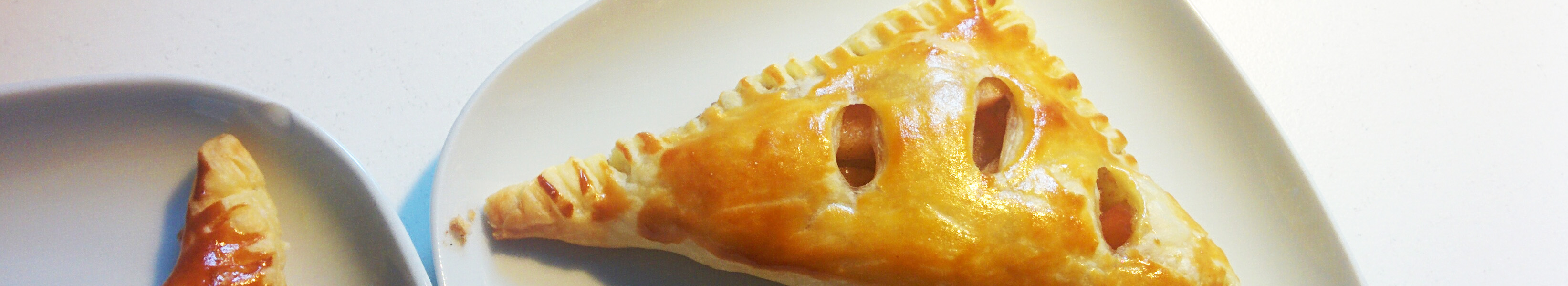 Blätterteig ausrollen und längs halbieren, quer dritteln. Im linken oberen Dreieck der resultierenden Quadrate einige Einschnitte machen. Die Füllung aus dem vorherigen Schritt auf die andere Hälfte der Quadrate geben.
